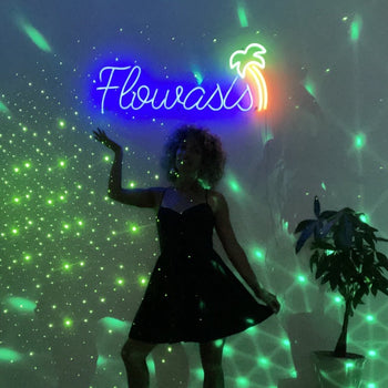 Her custom neon sign from yellowpop, “Flowasis,” stands as a reminder of her happy place. A state of mind where movement has no rules, the sun is always shining, and you’re right where you’re supposed to be.