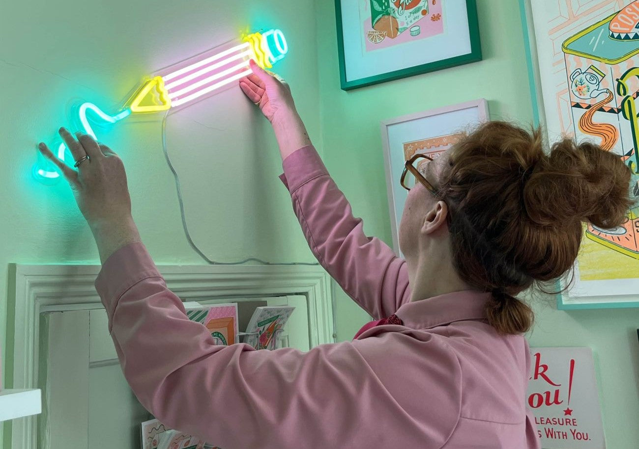 From sketchbook to shining centerpiece, Jacquie’s signature style gets a luminous twist. Think: hand-drawn whimsy meets glowing, graphic joy.