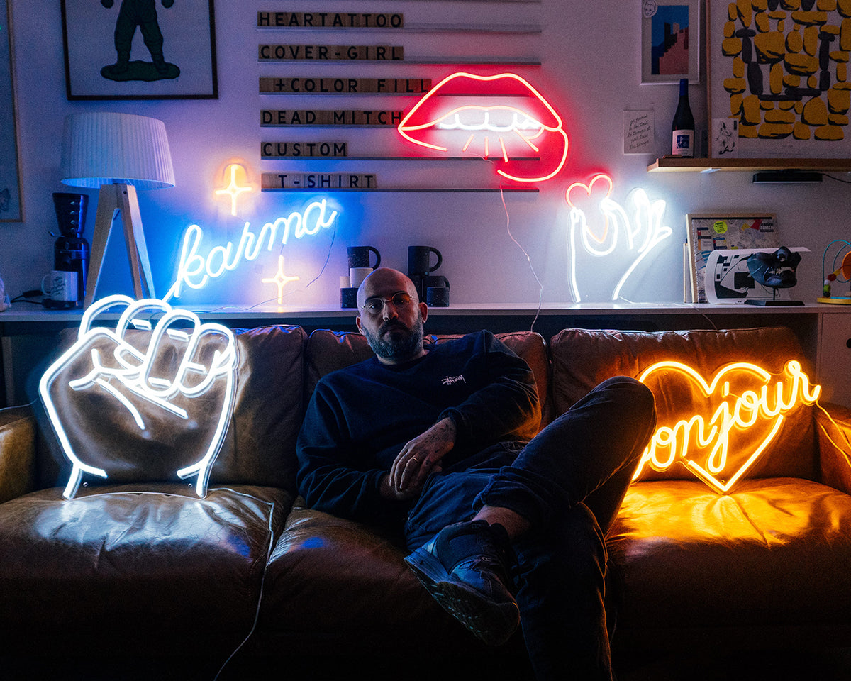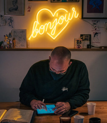 Jean André is a French artist, illustrator, and co-founder of the Bon Jour Tattoo club. Beyond his stunning tattoo work, he has collaborated with multiple brands on art direction and collaborations such as Nike, Adidas, Maison Kitsuné, Colette, and more. While his designs are sensual with flourishing line-art foundations, they retain an alluring air of class and poise, a genre of tattoo art that Jean André has named “Gentleman Art.” This originality appealed to us the moment we saw his artwork, we knew they’d make stunning LED neon signs! André’s desire to add a glow-in-the-dark element to his artwork made his designs a perfect match for our neon artwork. We’re proud to reintroduce this collaboration with these four refurbished designs!