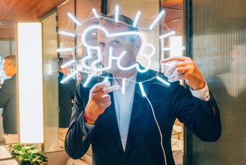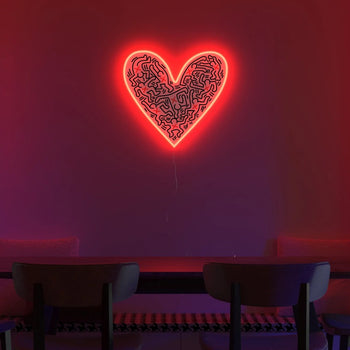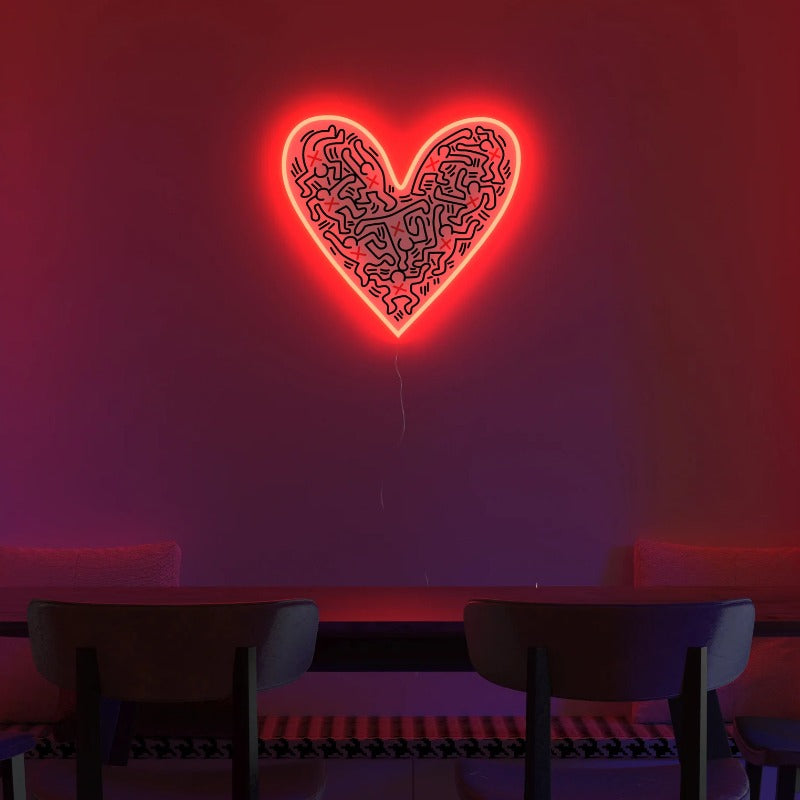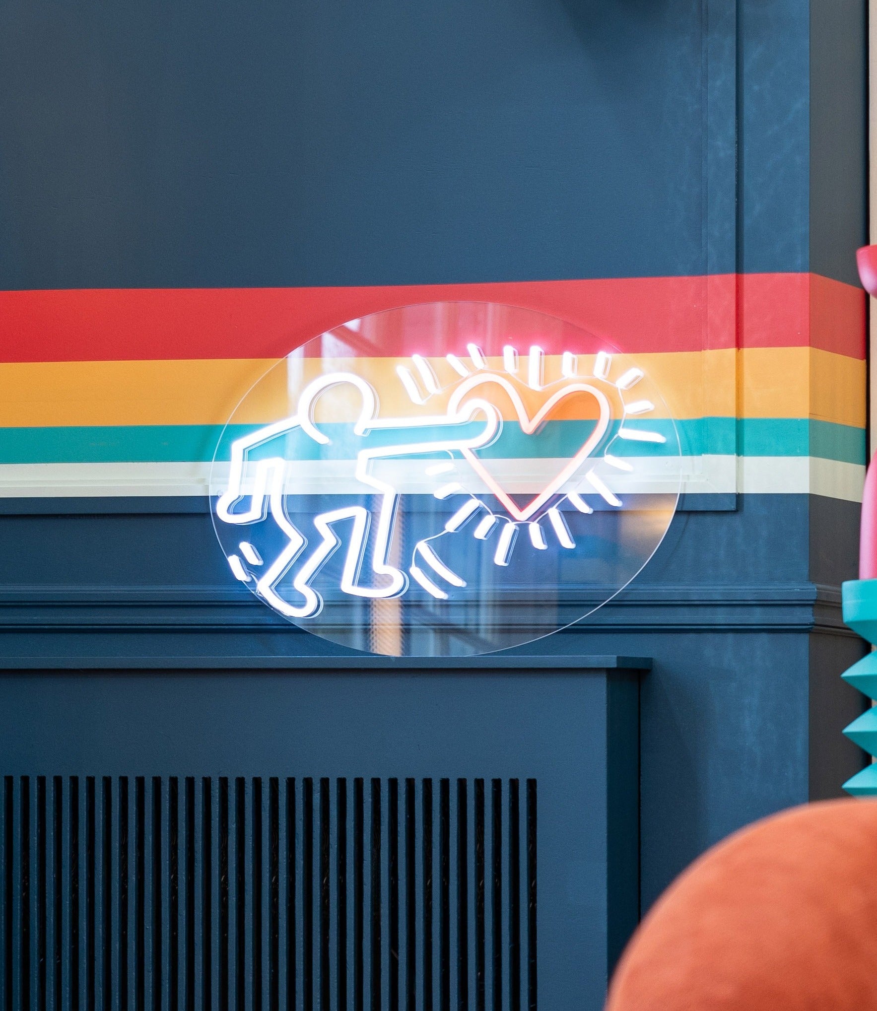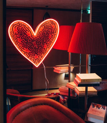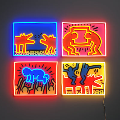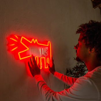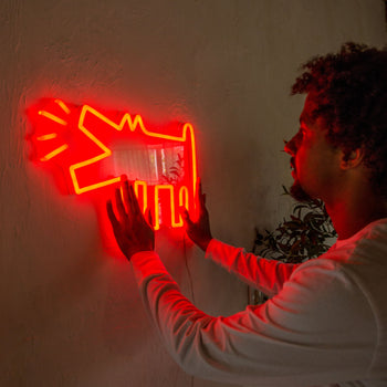 The artistic collaboration brings forth 10 LED neon signs and 5 adhesive wallpapers bearing symbology that’s reminiscent of Haring’s signature pop art and murals from the 80s and 90s that still ring true today.