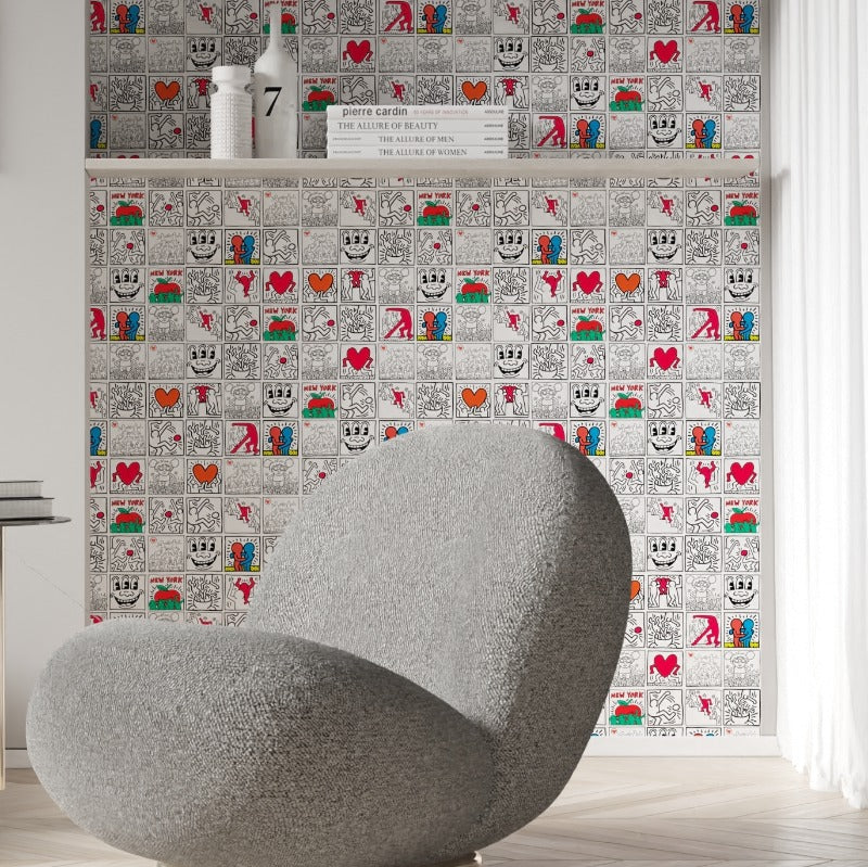 These six peel-and-stick wallpaper designs feature iconic imagery such as Haring’s expressive figures, Andy Mouse, three-eyed face, and other symbols famously seen in the subways of New York, or on the walls of its museums. Now you can bring this artwork home with energized, easy-to-apply patterns.