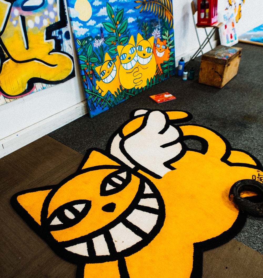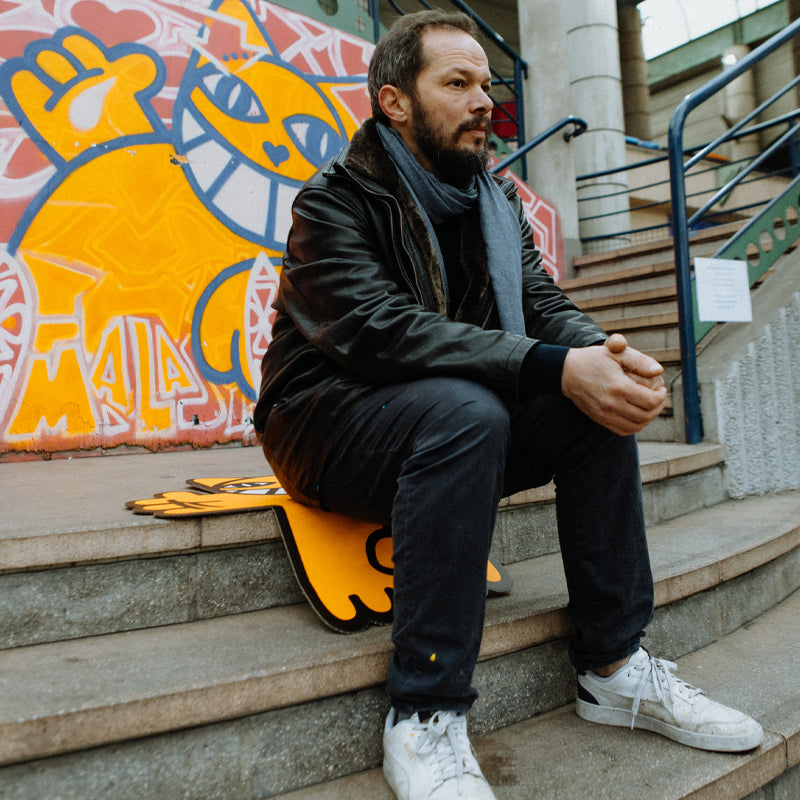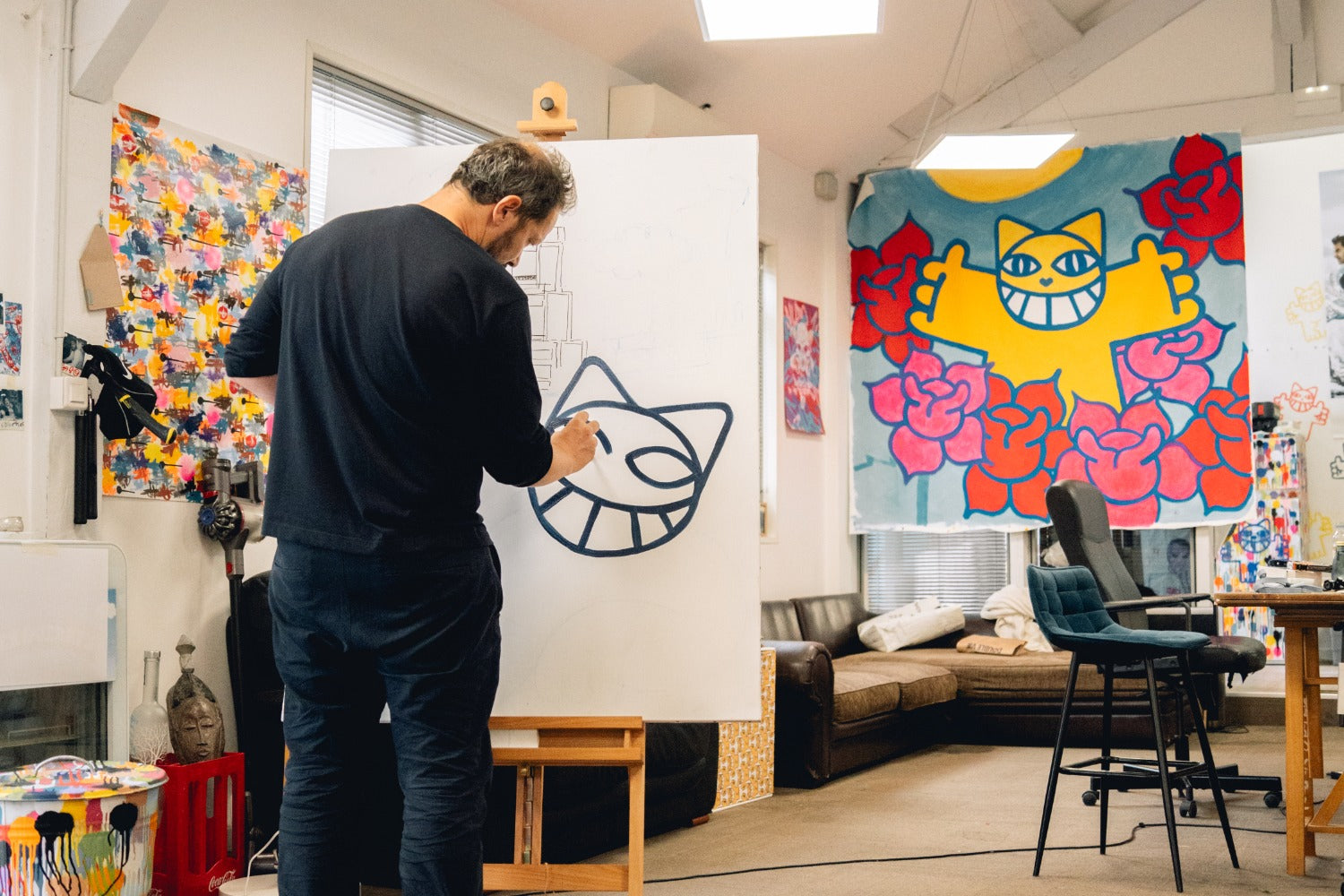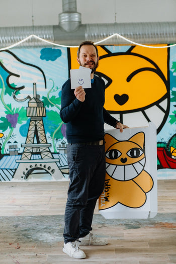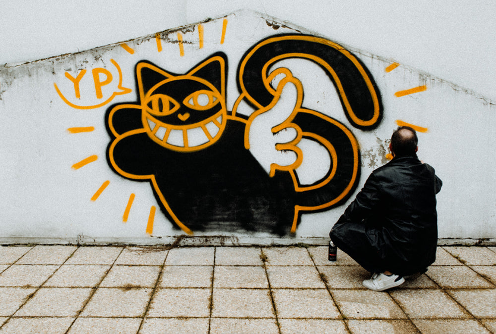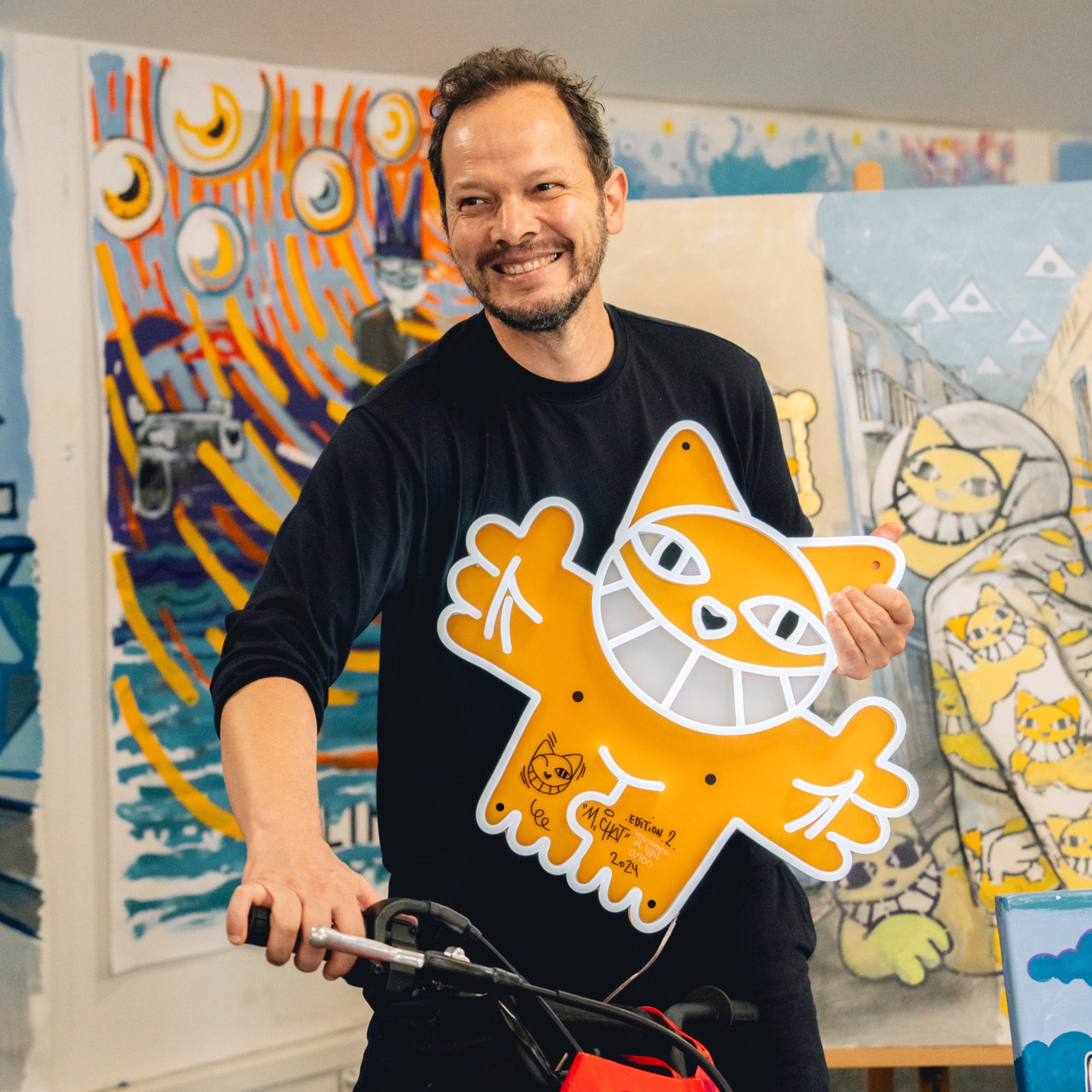The Franco-Swiss artist behind the infamous M. CHAT, began his street-art career with graffiti works at his local high school. He studied for a time at Beaux-Arts before going on to introduce the world to M. CHAT in 1997, on the walls of Orléans. Thoma was at the head of the street art movement of the early 2000s with his iconic M. CHAT character. Since then, he has gone on to paint murals on the walls of Paris, New York, Senegal, Brazil, and many more. His iconic character has appeared in museums, on t-shirts, and even in a coloring book. Thoma Vuille is one of France’s most famous street artists and his M. CHAT has become a cultural icon, in France and around the world.