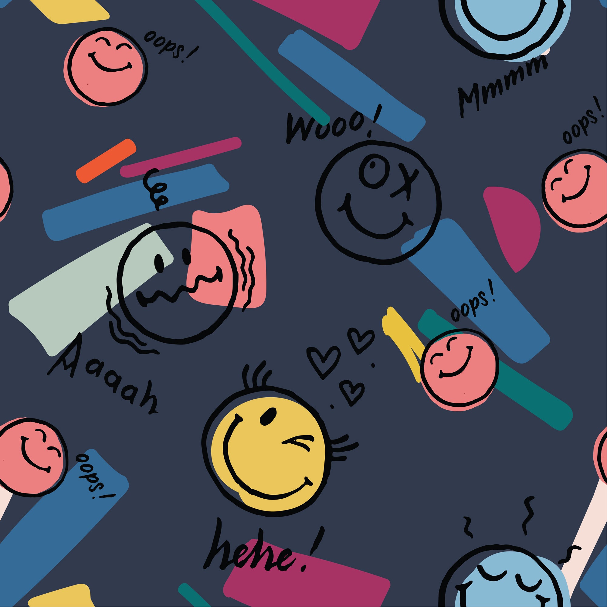 スマイリーフェイスの文化的アイコンに新鮮な印象を与えるパターンです。