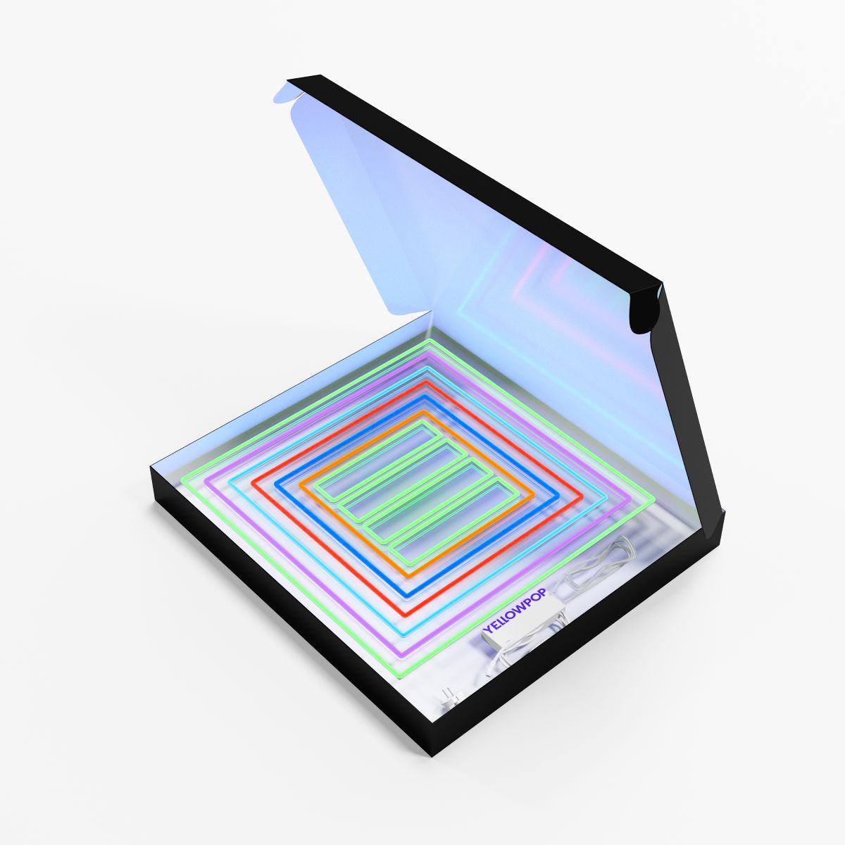 Peter Halley x Yellowpop限定コレクションの第一弾デザイン「001」をご覧ください。この光り輝く作品は、Halleyの象徴的な視覚言語である、重なり合う四角形と構造的なフォルムを、輝くネオンカラーで再解釈しています。