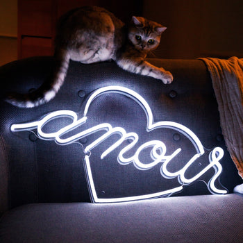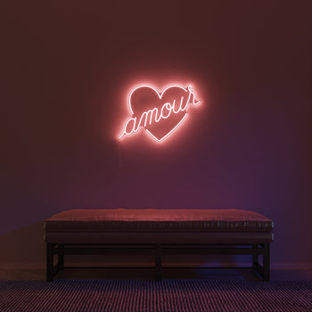 Love shines brightest when shown in the flourishing style of Parisian tattoo artist Jean André! This limited-edition LED neon sign features a heart with the word “Amour” in cursive typography. This sign is available in two sizes, and you can further