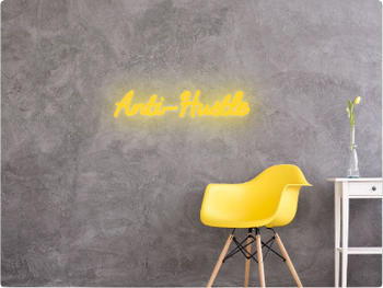Each sign is made of a neon flex material, consisting of PVC or Silicon piping with LED lights, that is mounted on a recycled acrylic board. These materials allow us to create realistic neon signs, with bright lights and intense color, while being more durable, affordable, and sustainable than traditional neon.