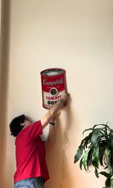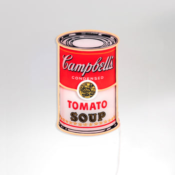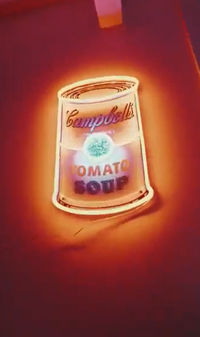 Red and white neon art inspired by Andy Warhol’s iconic Campbell’s Soup can.
