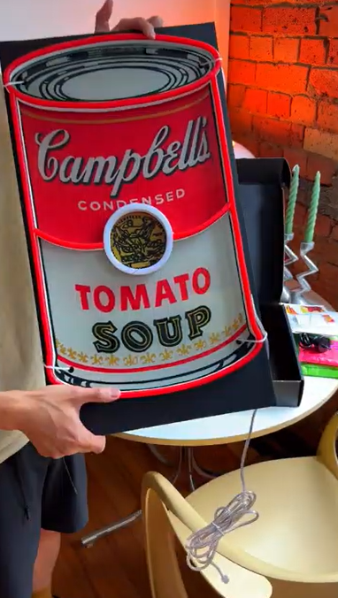 This neon artwork is mounted on 5mm clear acrylic, creating a seamless, floating effect. Handcrafted with precision, this piece includes a touch dimmer for customizable brightness. Campbell’s is a collectible for those who appreciate Warhol’s lasting impact on art and culture, merging iconic imagery with modern design.